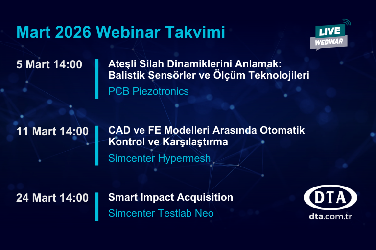 DTA Mühendislik olarak, Test ve Simülasyon çözümlerini sizlerle buluşturmaya devam ediyoruz. Mart ayı boyunca, ateşli silah dinamiklerinden CAD-FE entegrasyonuna kadar geniş bir yelpazede uzmanlık alanlarını…